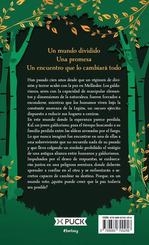 Detalles: Cuenta la leyenda que Melliedor no siempre fue un mundo fragmentado. Se dice que en tiempos remotos convivían pacíficamente humanos y galdurianos, seres mágicos en quienes se aloja una poderosa energía de la naturaleza. Hasta que, durante una noche con tres lunas, se impuso un temible régimen que puso fin a su amistad. Algunos se vieron obligados a esconderse en rincones sombríos; otros; a vivir con el temor de que sus hogares fuesen reducidos a cenizas. La Paz estaba rota. La llama del amor humano-galduriano, apagada. La memoria de un mundo diferente había caído en las garras del olvido. O eso es lo que se creyó durante cien años… Cuando un joven de ojos azules encuentra a una chica que carga un símbolo prohibido, todo lo que se pensó era imposible quedará en duda. Porque, quizás, las letras de las canciones no están del todo equivocadas. Y la esperanza de un Melliedor unido está más cerca de lo que parece…